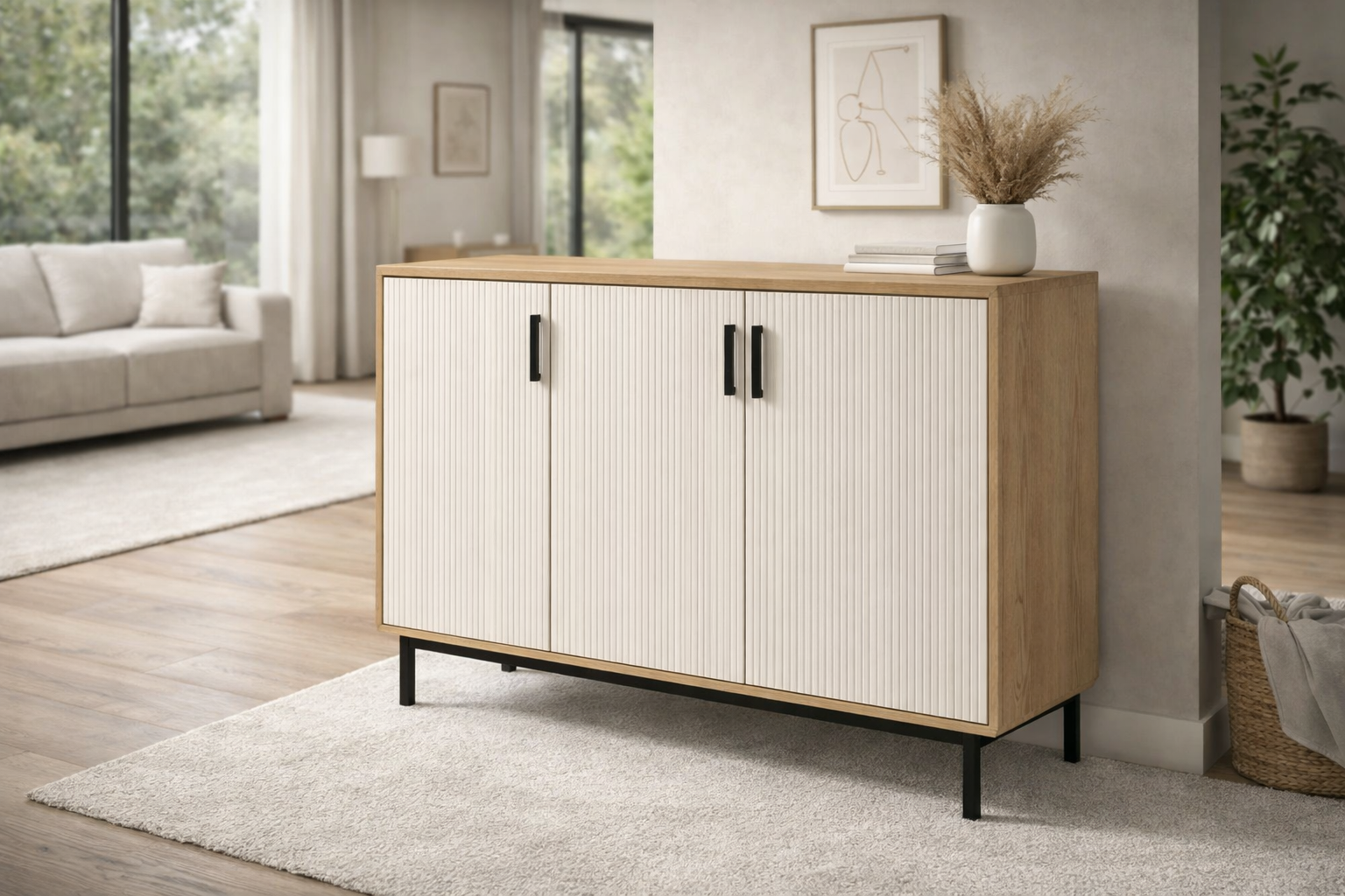 Dieses elegante Sideboard kombiniert natürliche Holzoptik mit modernen Lamellenfronten und klaren Linien. Perfekt für Wohnzimmer, Esszimmer oder Flur – bietet es großzügigen Stauraum und verleiht jedem Raum eine warme, stilvolle Atmosphäre.